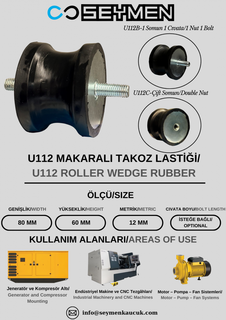 U112 vibrasyon takozu; makine, jeneratör ve endüstriyel ekipmanlarda oluşan titreşim ve darbeleri sönümlemek için tasarlanmış, kauçuk ve metal birleşimli profesyonel bir izolasyon elemanıdır. Çalışma sırasında ortaya çıkan titreşimlerin zemine ve çevre ekipmanlara iletilmesini azaltarak makine stabilitesini artırır, gürültüyü düşürür ve sistem ömrünü uzatır. Titreşim takozları, mekanik sistemlerde oluşan darbe ve titreşimleri absorbe ederek güvenli ve verimli bir çalışma ortamı sağlar.