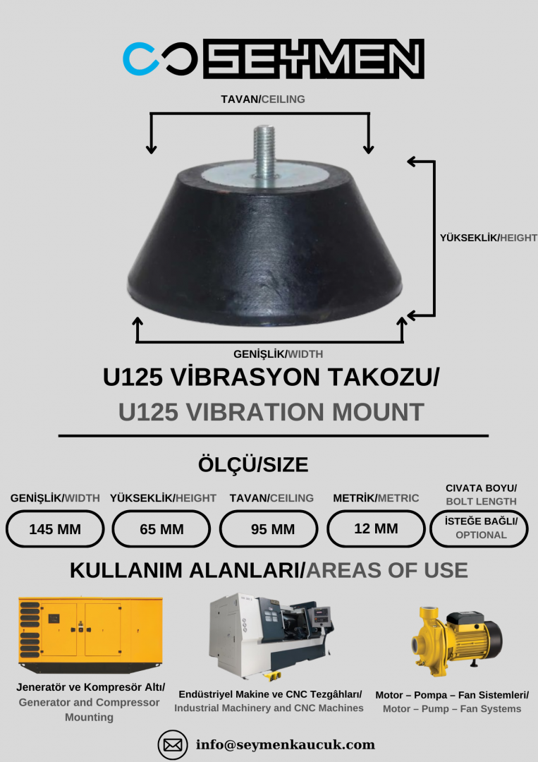 U125 vibrasyon takozu, makine ve ekipmanlarda oluşan titreşim ve darbe etkilerini azaltarak daha stabil, sessiz ve uzun ömürlü bir çalışma ortamı sağlayan kauçuk-metal birleşimli bir izolasyon elemanıdır. Endüstriyel kullanım için geliştirilen bu model; jeneratör, kompresör, CNC tezgâhları, motor ve çeşitli makine sistemlerinde güvenle tercih edilir.